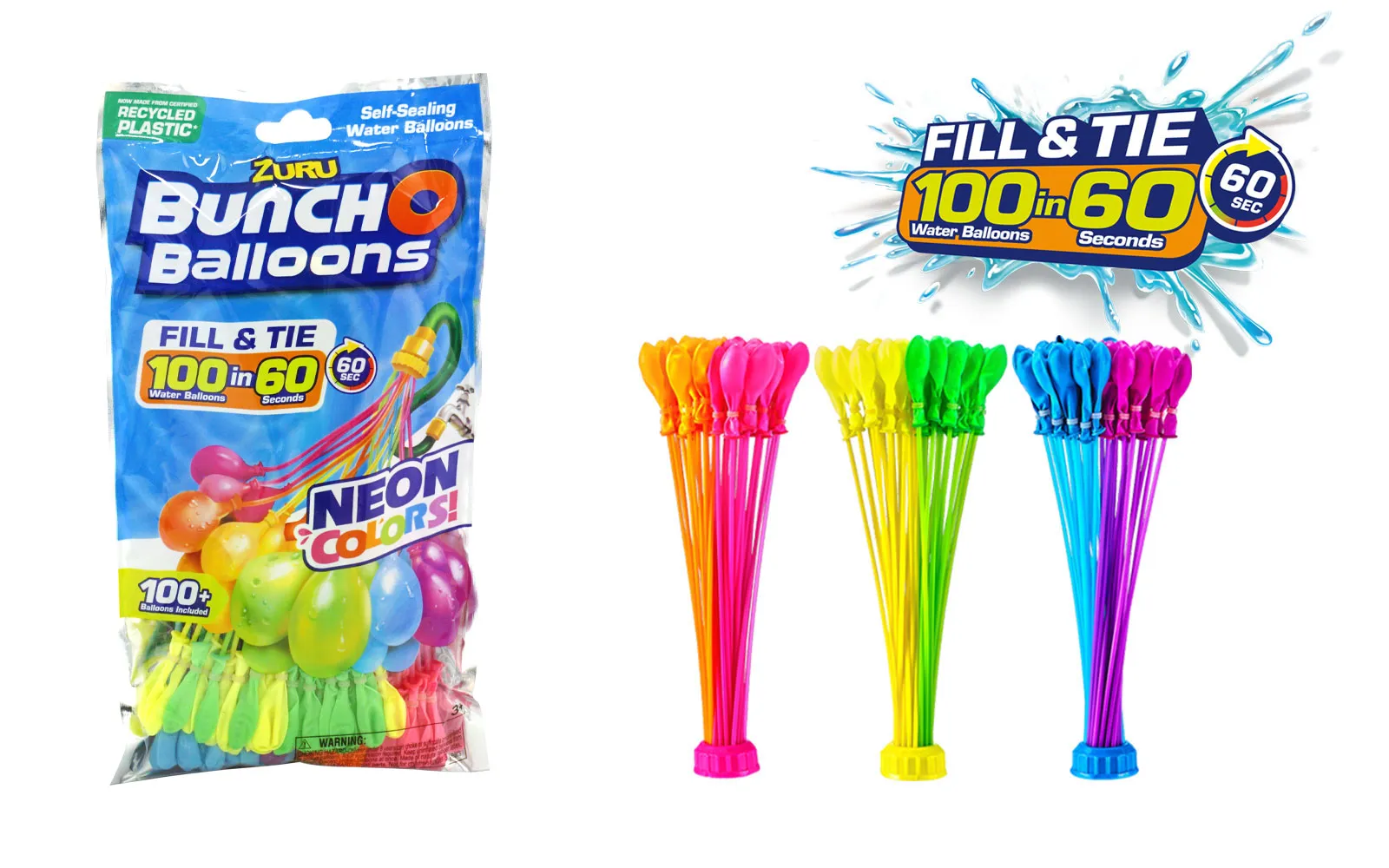 Bunch O Balloons Neon von Zuru. Füllen Sie 100 Wasserballons, die sich in nur 60 Sekunden automatisch binden. Kein mühsames und zeitaufwändiges Füllen und Binden mehr, nur noch Spaß.