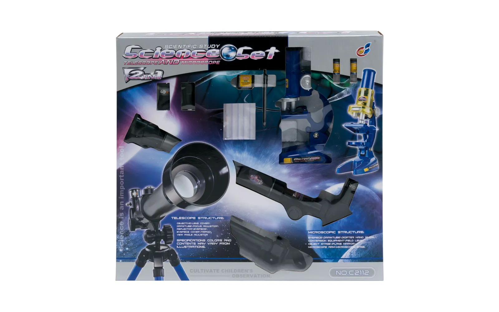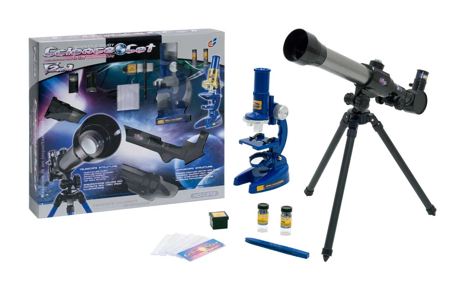 ERFORSCHEN SIE DIE WELT VON MIKROSKOPISCHEN DETAILS BIS HIN ZU FERNEN GALAXIEN! Dieses bemerkenswerte wissenschaftliche Set kombiniert ein Teleskop und ein Mikroskop und ermöglicht es Kindern, ihren Horizont zu erweitern – von der Erkundung winziger Strukturen unter dem Mikroskop bis hin zur Beobachtung des Sternenhimmels. Die ideale Wahl für junge Entdecker, die sich für die Welt der Wissenschaft und Entdeckungen interessieren! EIN TELESKOP FÜR DIE BEOBACHTUNG DES WELTRAUMS: ausgestattet mit einem Kompass und einem verstellbaren Okular. Vergrößerungsoptionen: 20x, 30x und 40x für eine detaillierte Himmelsbeobachtung. Objektivdurchmesser: 60 mm für ein klares und helles Bild. EIN MIKROSKOP FÜR DIE ERFORSCHUNG DER MIKROWELT: Vergrößerung: 100x, 200x, und 450x für extrem detaillierte Einblicke. Inklusive einer Taste zur Fokuseinstellung, einem Stativ und Werkzeugen zur Probenvorbereitung. SET INHALT: ein Teleskop mit drei verschiedenen Vergrößerungen, ein hochauflösendes Mikroskop, Erkundungsausrüstung. Lassen Sie Ihr Kind die wissenschaftliche Neugierde fördern und die Welt auf eine ganz neue Art und Weise erkunden!