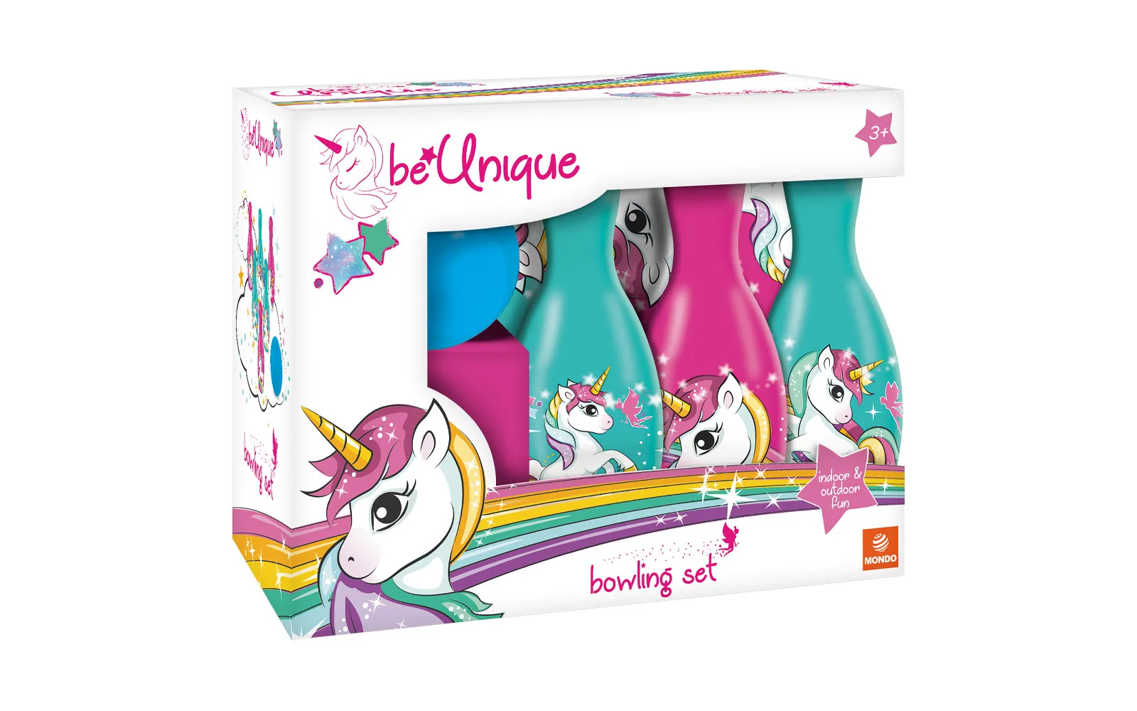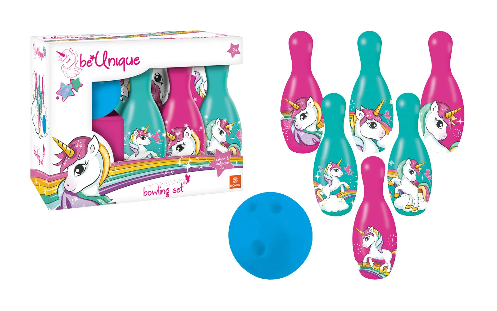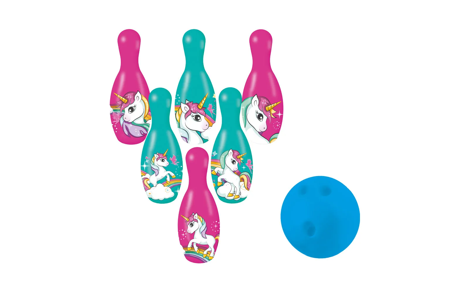 Ein Set aus sechs Bowlingpins und einer Kugel mit einem Einhornmotiv. Der Pin ist 18 cm hoch.
