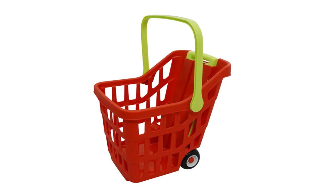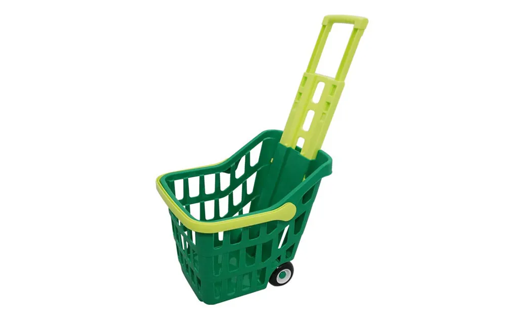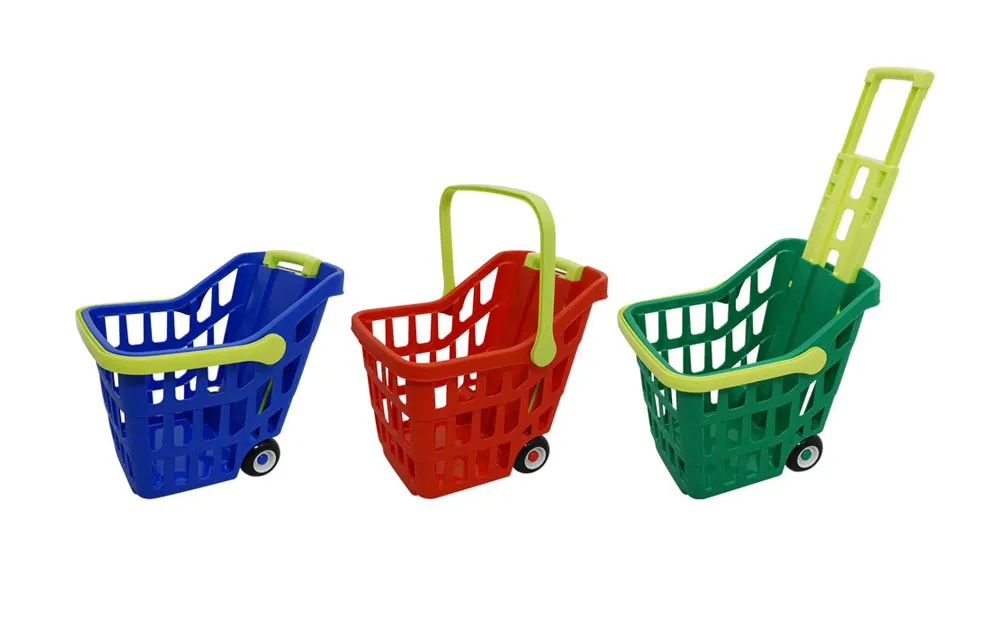 Ein Einkaufskorb auf zwei Rädern mit zwei Arten von Griffen und in blauer, roter oder grüner Farbe, Größe 24,5×29,5×28 (60) cm. Ein Griff ist höhenverstellbar.