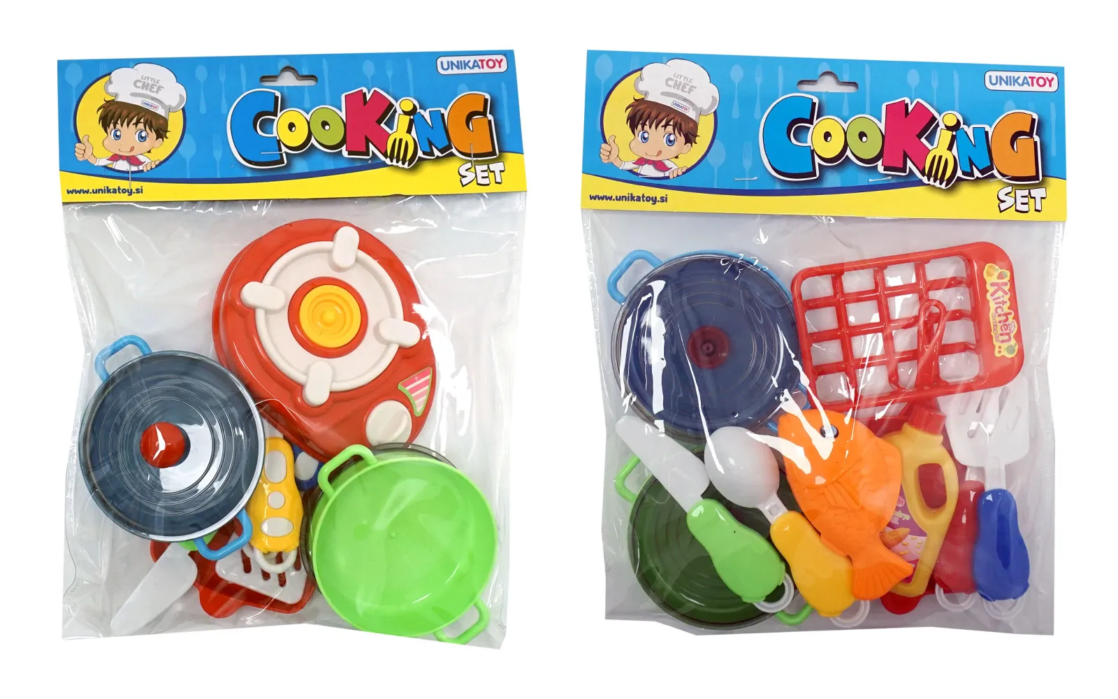 Das farbenfrohe Kochset in zwei verschiedenen Ausführungen enthält zahlreiche und vielfältige Kochutensilien – eine Kochplatte oder einen Wasserkocher, Tassen, Pfannen und Besteck.