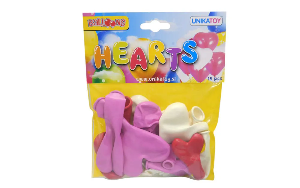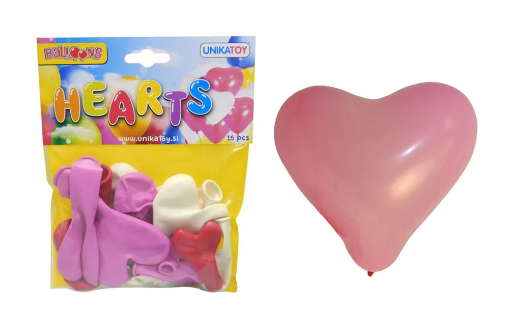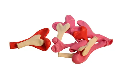 Die Form des Herzens ist ein aufgeblasener Ballon in roter, rosa oder weißer Farbe. Es sind 15 Ballons in der Tüte.