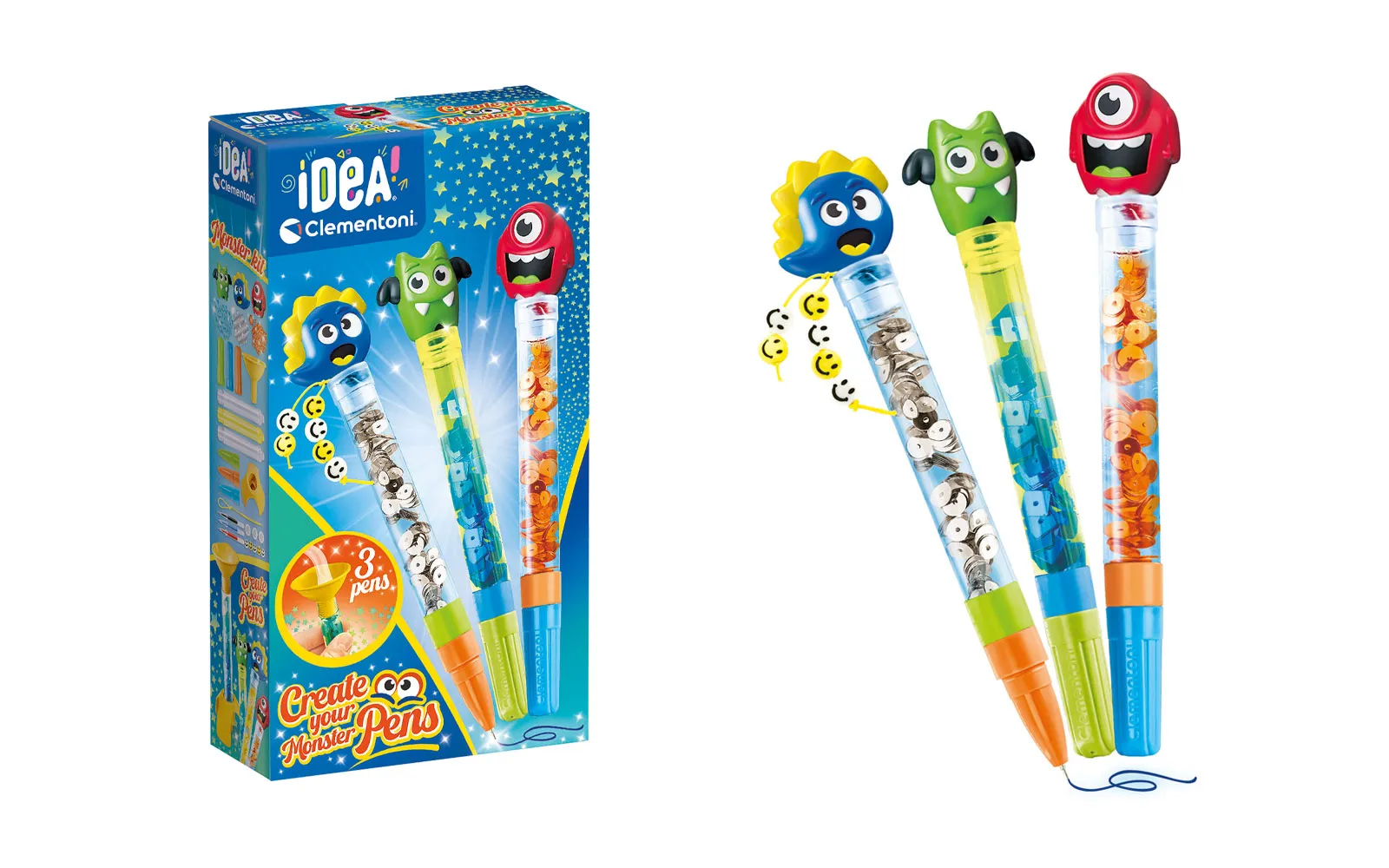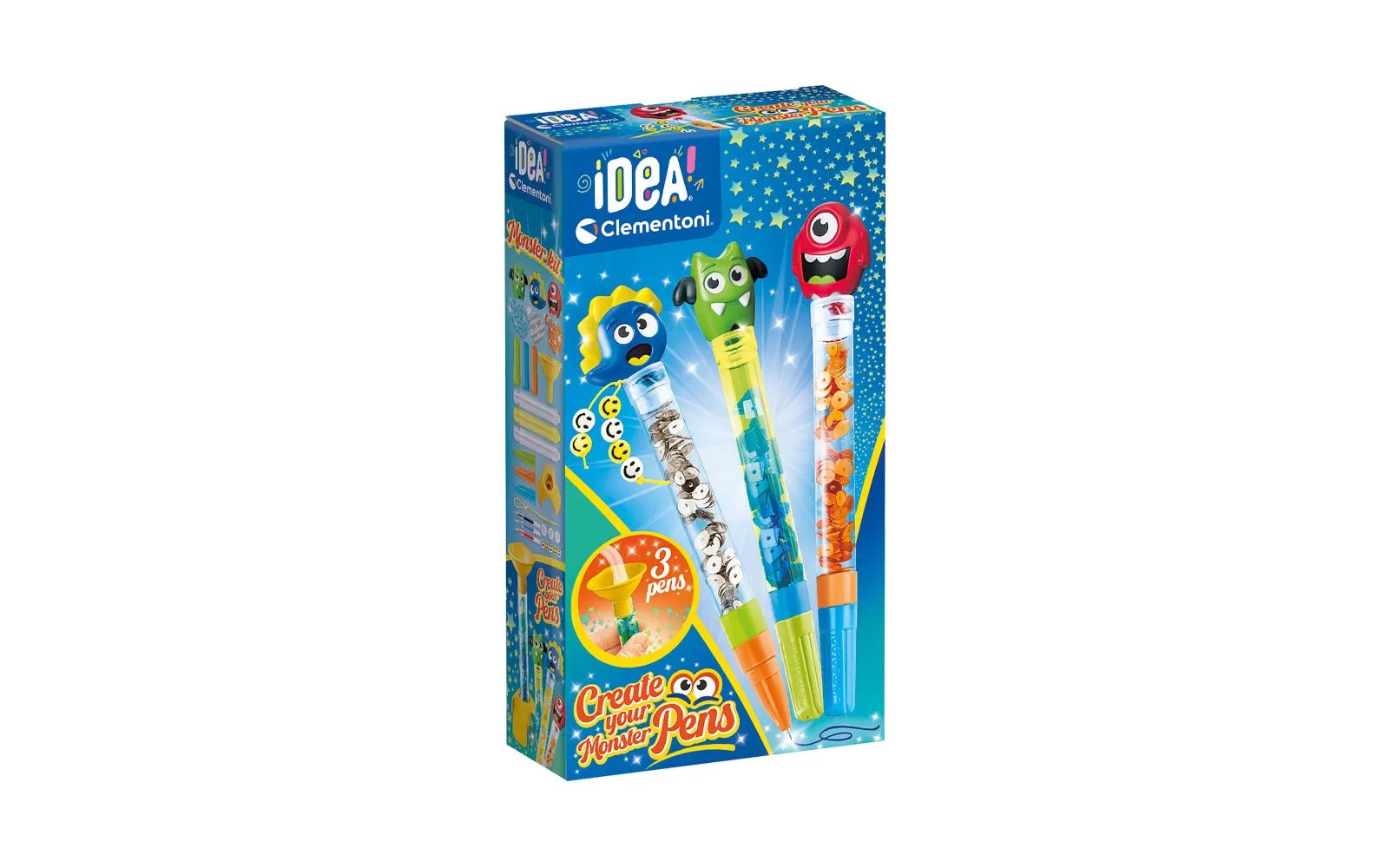 Idea Pens Create – Monster, Clementoni. Die Stifte sind lebendige Farben mit verschiedenen Bildern – aus der Welt der Monster. Das Set enthält 3 Stifte mit Monstermotiven. Die Stifte sind in verschiedenen Farben erhältlich. Kinder können die Stifte mit Extras versehen und so einzigartige Produkte kreieren.