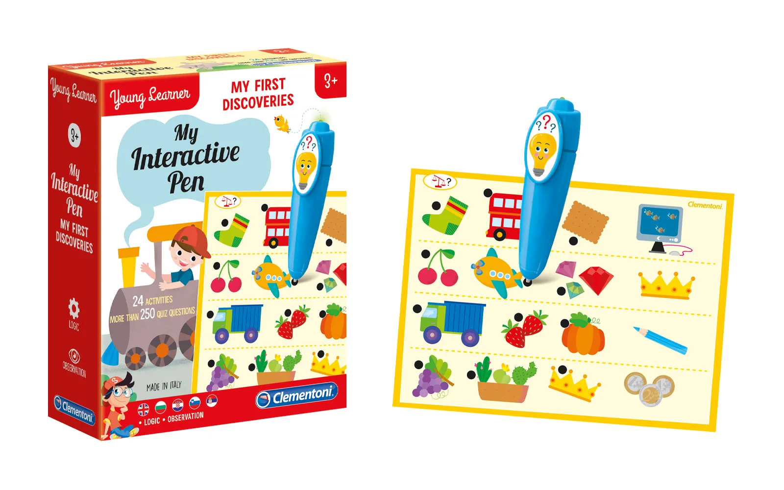 Ein interaktives didaktisches Bleistiftset mit verschiedenen zusätzlichen Spielen, bei denen Kinder neue Formen, Größen und Farben lernen und ihre Beobachtungsgabe und Entscheidungsfreiheit verbessern. Der interaktive Bleistift mit verschiedenen Spielen der Marke Clementoni enthält mehr als 250 verschiedene Fragen auf 24 Kacheln, auf die das Kind mit Hilfe eines Lichts auf dem interaktiven Stift Antworten erhält. Wenn das Licht grün leuchtet, ist die Antwort richtig, andernfalls muss sich das Kind mehr anstrengen, um die richtige Lösung auf verschiedene andere Arten zu finden. So wird das kritische Denken gestärkt und die Problemlösungsmethode effektiv stimuliert. Mit diesem wunderbaren interaktiven Set lernen die Kinder, ihre Aufmerksamkeit zu fokussieren und ihre Konzentration zu stärken, während sie gleichzeitig einen Riesenspaß haben. Sie entwickeln außerdem ein sehr gutes logisches Denken. Das interaktive Set ist für Kinder ab drei Jahren geeignet und ermutigt sie zum selbstständigen Spielen. Das Set enthält: einen interaktiven Stift, 12 Papierplättchen mit verschiedenen Aktivitäten auf beiden Seiten und mehr als 250 Fragen. Eine Anleitung ist ebenfalls in dem Set enthalten. Der interaktive Stift funktioniert mit 3*1,5V Batterien vom Typ LR41, die zu Demonstrationszwecken mitgeliefert werden.