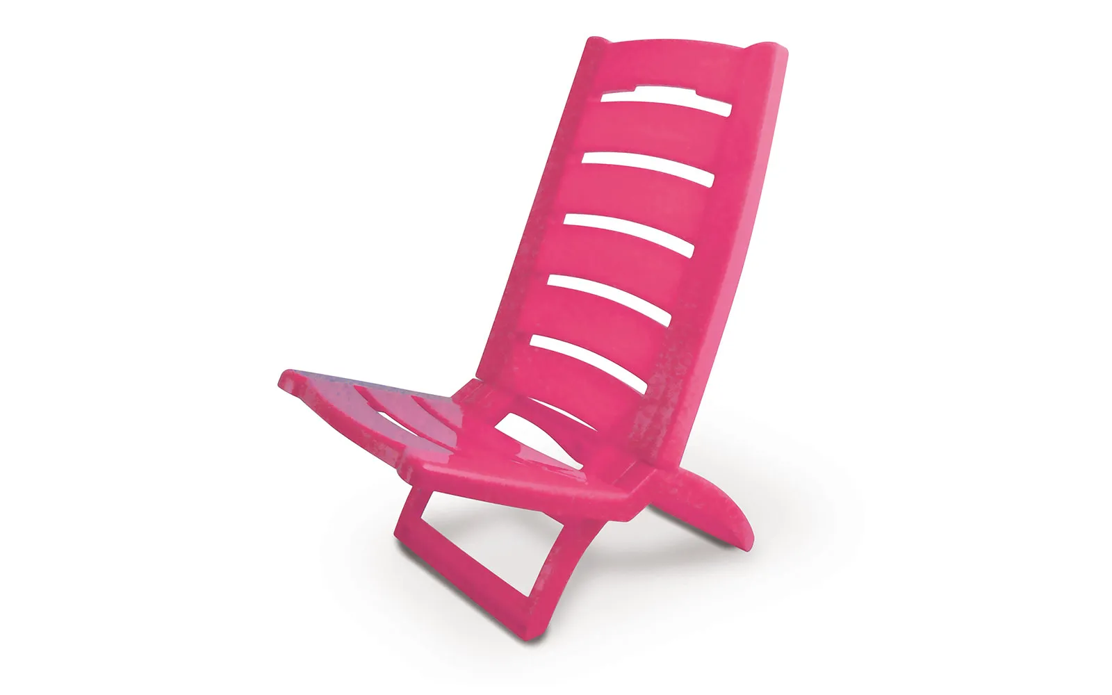 Ein praktischer faltbarer PVC-Stuhl in magenta-rosa Farbe, der eine Tragfähigkeit von bis zu 100 kg hat, um in der warmen Sonne oder im angenehmen Schatten zu sitzen, wenn die Sonne zu stark ist. Maße des montierten Stuhls: Länge: 37,5, Höhe: 65 cm, Tiefe: 55 cm und Bodenfreiheit: 27 cm. Hergestellt in Italien. Von Catas getestet.