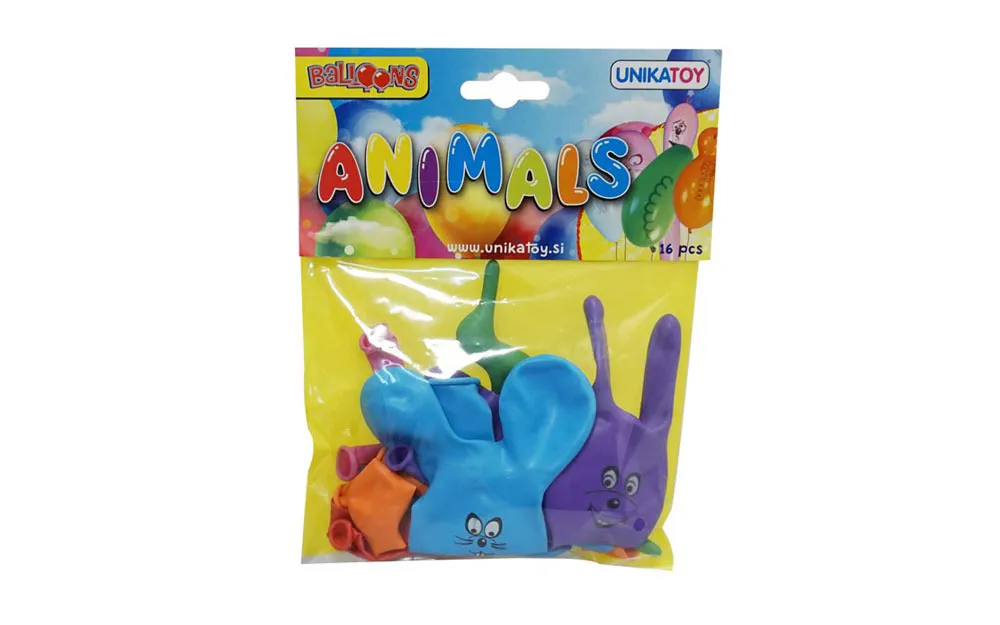 Die Tüte enthält 16 Ballons mit verschiedenen Tierformen und Bildern.