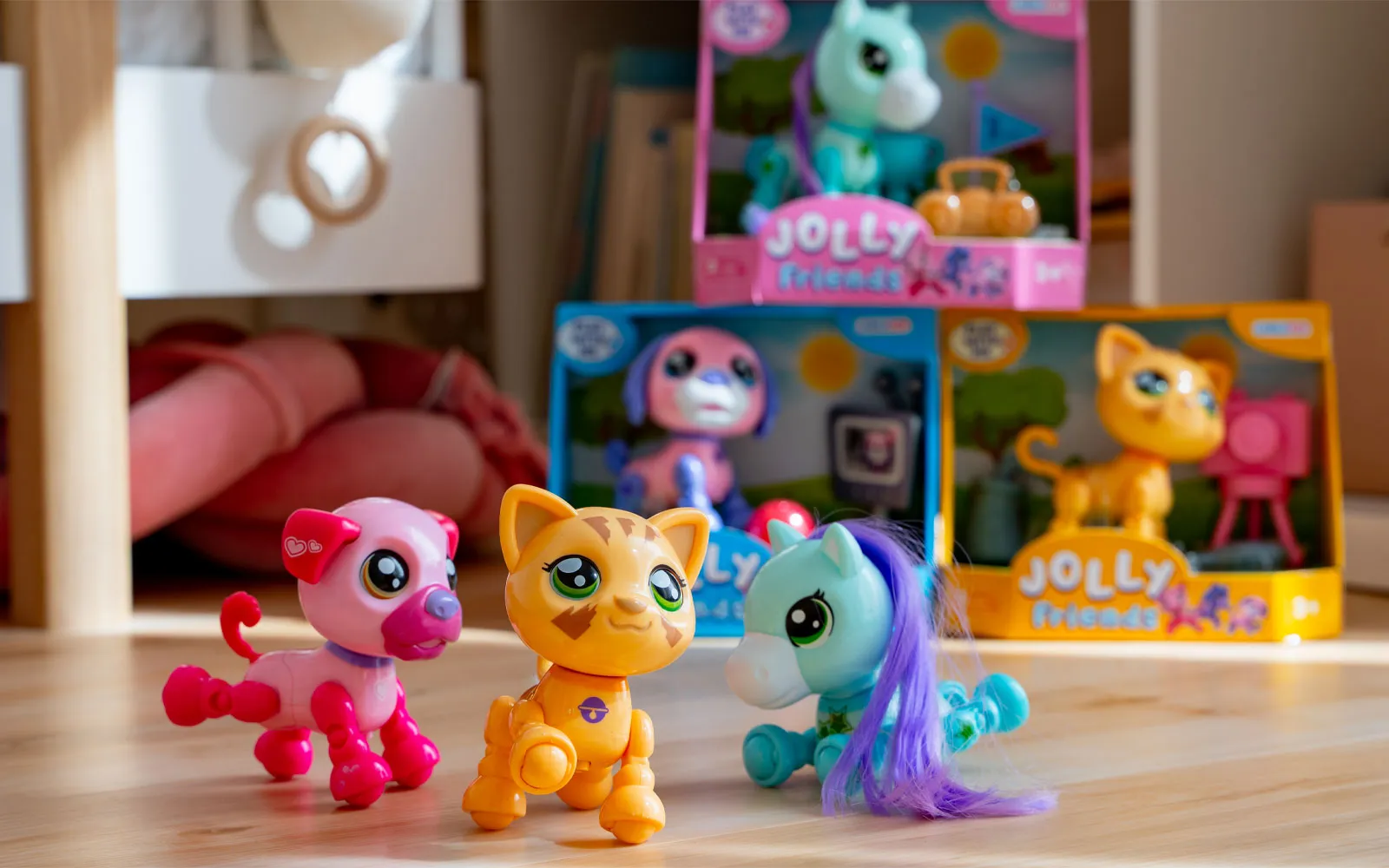 Entdecken Sie die Welt der magischen Kreaturen Jolly Friends Unikatoy. Es sind 10 verschiedene schöne Tiere in unterschiedlichen Farben erhältlich. Jolly Friends sprechen und machen niedliche Geräusche, wenn Sie sie an der Brust streicheln. Die Tiere haben nämlich einen eingebauten Berührungssensor. Ihre Beine sind auf Rädern und sie bewegen sich, ebenso wie ihr Schwanz und ihr Kopf. Das Set mit dem Tier enthält auch diverses Zubehör – einen Futterständer, einen Eimer, einen Knochen, eine Kamera, einen Fisch usw. Erhältlich als: Kätzchen, Welpe, Pony. Das Spielzeug ist für Kinder ab einem Alter von 3 Jahren geeignet.