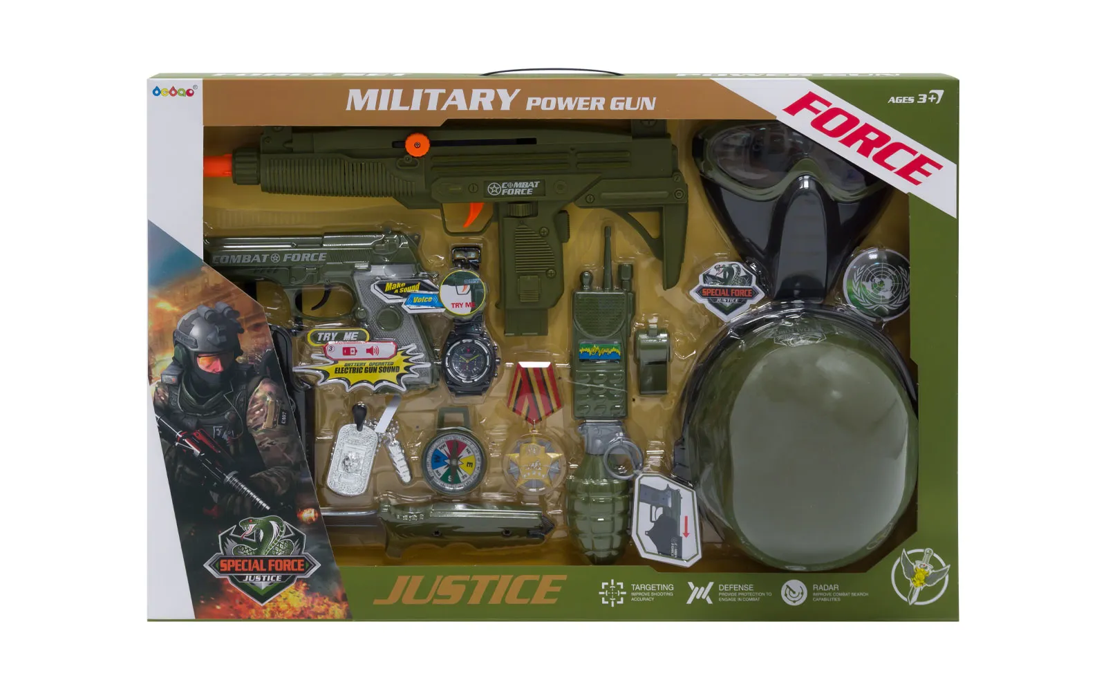 Batterie-Militärset mit Helm. Pistole -2 Batterien Typ „AG13 / LR44“ 1,5V sind zu Demonstrationszwecken enthalten.