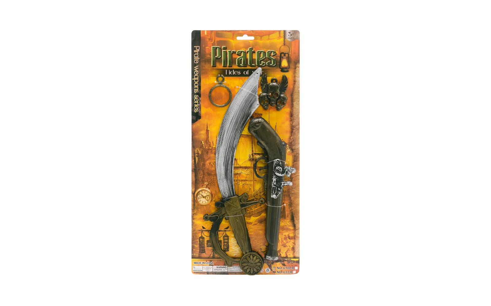 Piratenset mit einem Säbel, einer Pistole und einigem anderen interessanten Zubehör für fantasievolles Spiel in einer geheimnisvollen und aufregenden Piratenwelt.