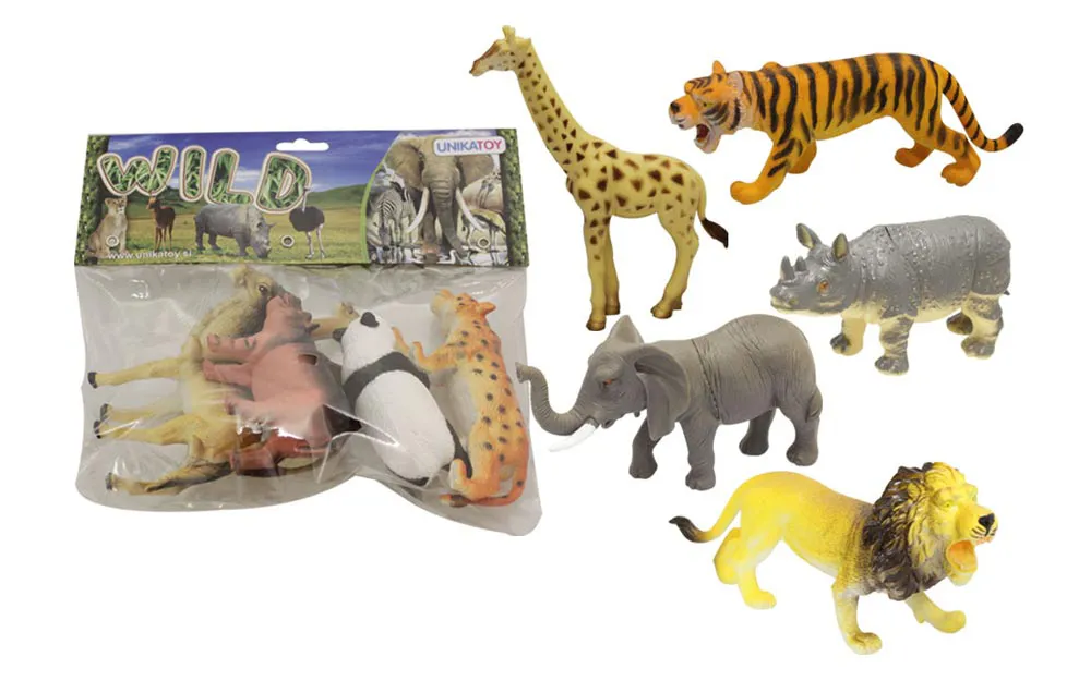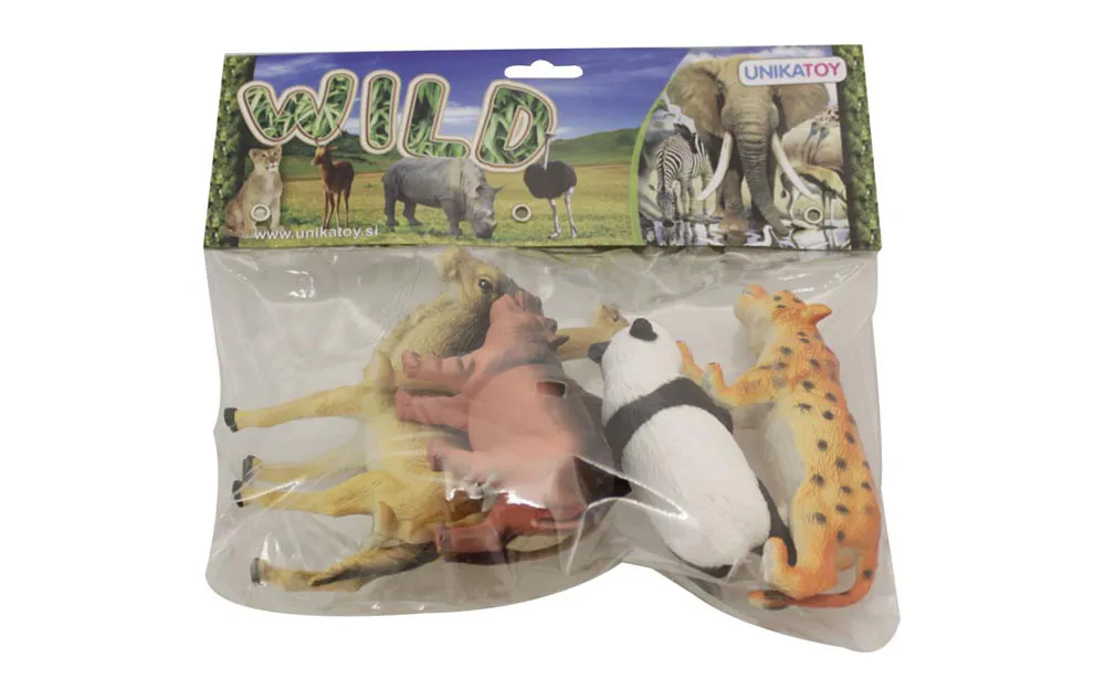 5 verschiedene pflanzenfressende und fleischfressende Wildtiere aus verschiedenen Kontinenten in einem Beutel für Kinder ab 3 Jahren.