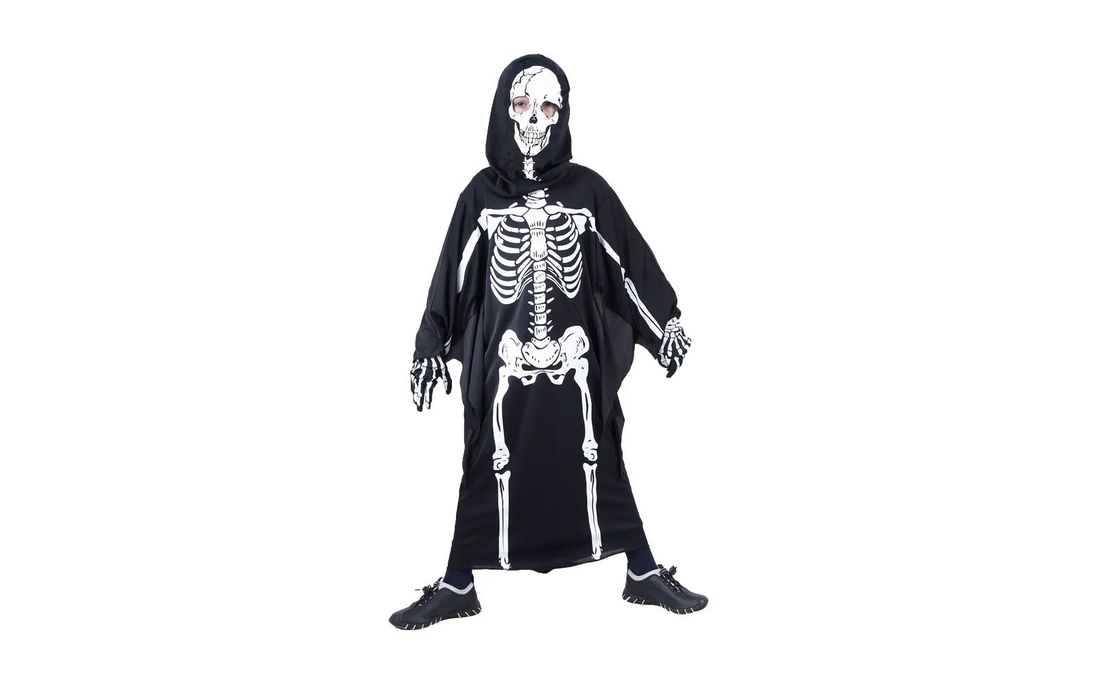 Das Skelett-Kostüm für Kinder besteht aus einem Kleid und einer Kapuze. Größe M (120-130 cm) und L (130-140 cm).