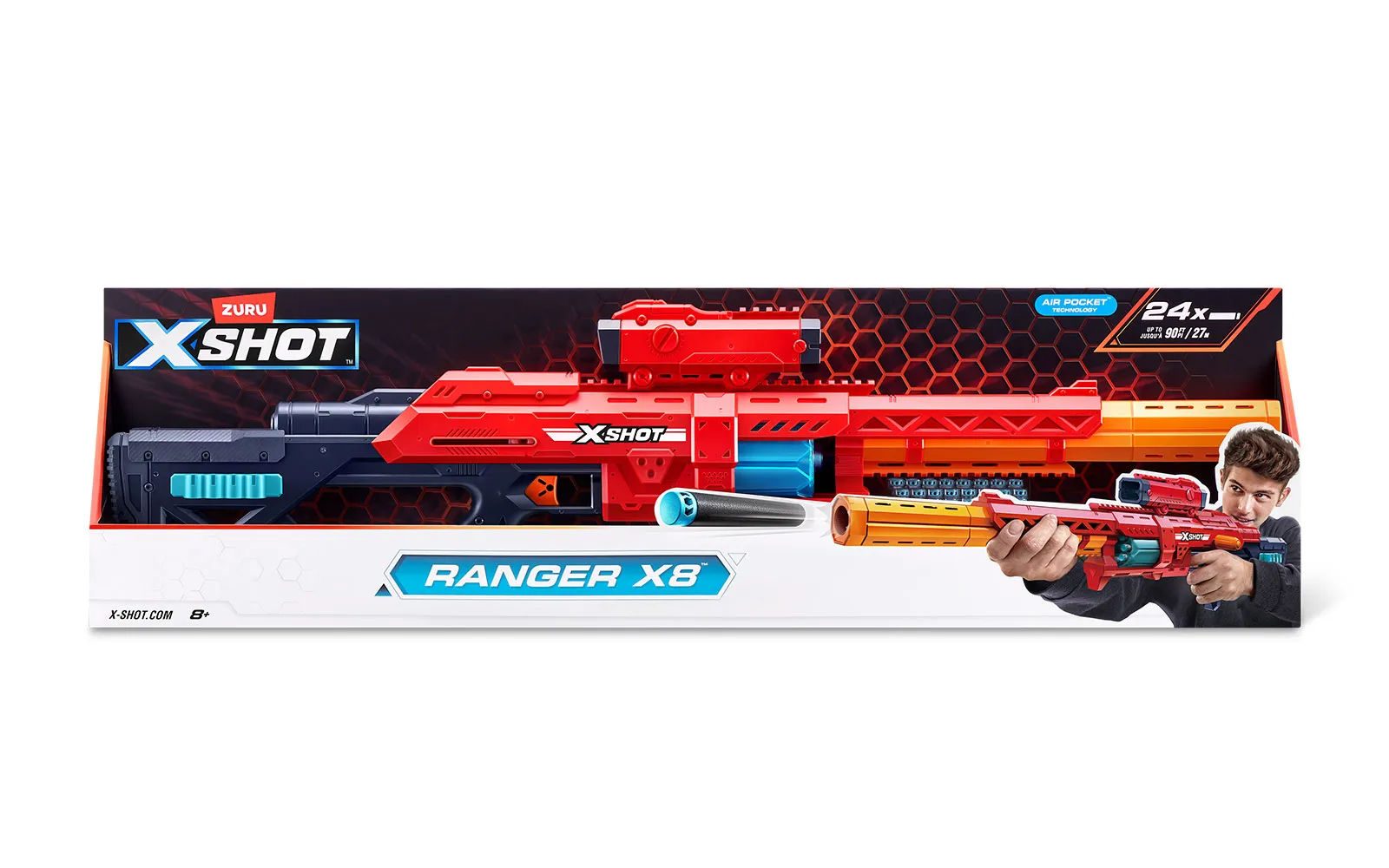 X-SHOT RANGER X8 GEWEHR, ZURU! BEREIT FÜR ACTION? Lernen Sie das X-shot Ranger X8 kennen, ein Gewehr, das Ihnen unvergessliche Momente adrenalingeladener Kämpfe bescheren wird! Mit einem rotierenden Lauf, der bis zu 8 Kugeln pro Sekunde abfeuert, wird jede Aktion schneller und aufregender sein. Da die Kugeln bis zu 27 Meter weit fliegen, haben Sie immer genug Reichweite für präzise Schüsse. BEREIT FÜR VERRÜCKTE KÄMPFE? Das Set enthält 24 Schaumstoffkugeln und Platz für weitere 8 Kugeln, so dass Sie immer für den nächsten Schuss bereit sind. Fügen Sie ein Scharfschützenzielfernrohr hinzu, das das Zielen erleichtert, und nehmen Sie an einer verrückten Schlacht mit Ihren Freunden teil! SET INHALT: 1 X-shot Ranger X8 Gewehr, 24 Schaumstoffkugeln, Scharfschützenzielfernrohr. Jetzt ist es an der Zeit, Ihre Schießkünste unter Beweis zu stellen und der Gewinner der Schlacht zu werden! Geeignet für Kinder ab 8 Jahren.